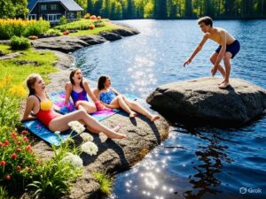“Sunshine had permeated the dock, the planks of my skiff, even the bedrock. Everything radiated heat. Daisies, red clover, and Queen Anne’s lace exploded into bloom … As well, youngsters from near and far thronged to the Little Rock to seize what was left of the summer. Swimming, sunbathing, and flirting reached a crescendo.